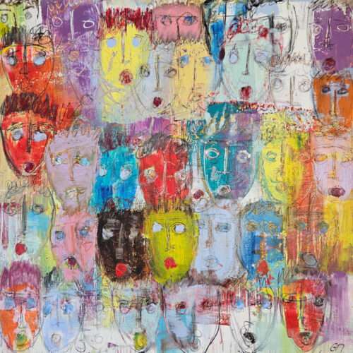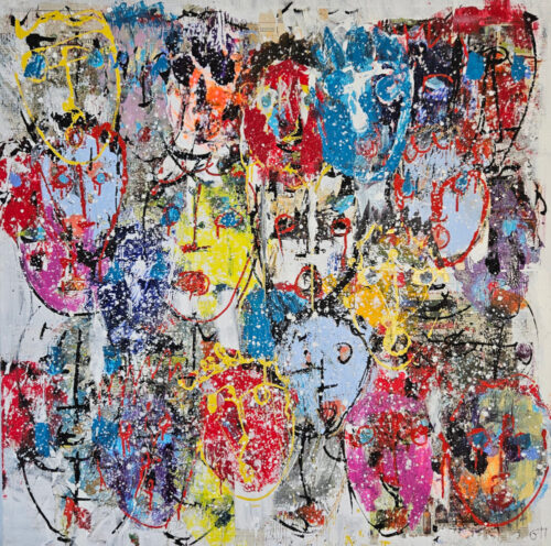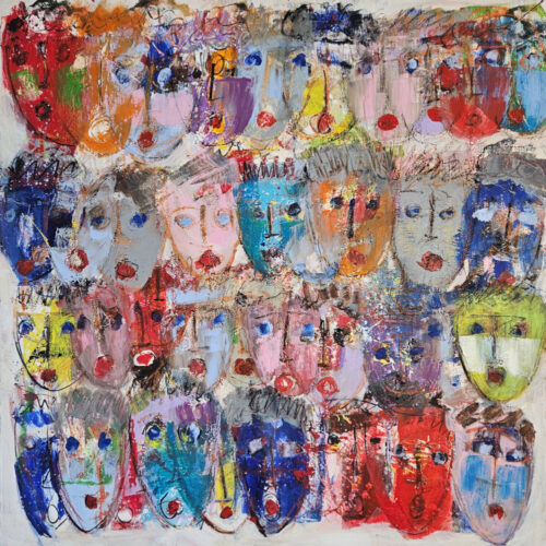 • Multicolored Heads on a Textured Background, acrylic painting on canvas, 100×100 cm