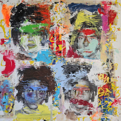 Pop Art tribute to Basquiat, acrylic painting and collage on canvas, 100×100 cm.