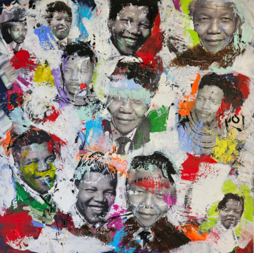 Pop Art tribute to Mandela, acrylic painting and collage on canvas, 100×100 cm.