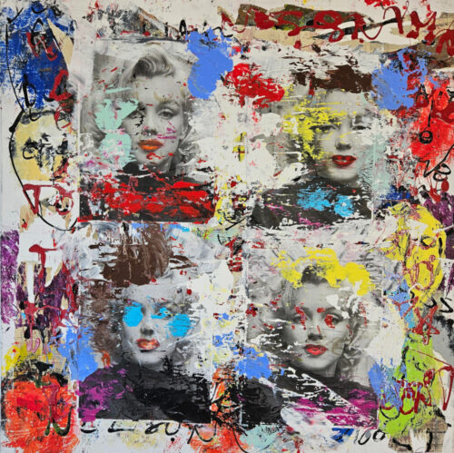 Pop Art tribute to Marilyn, acrylic and collage on canvas, 100x100cm.