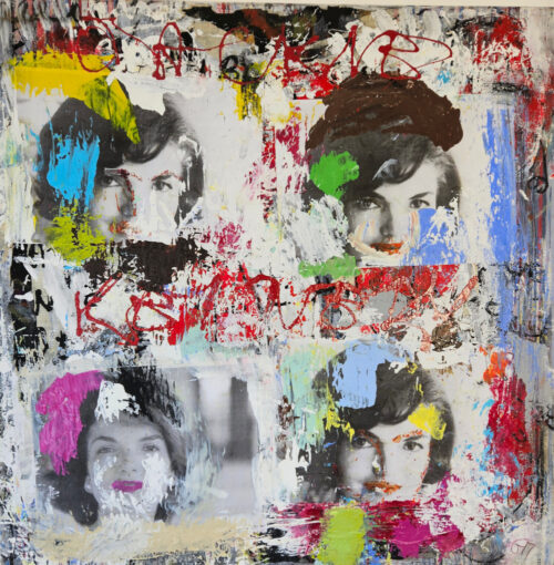 Pop Art tribute to Jackie, acrylic painting and collage on canvas, 100×100 cm.